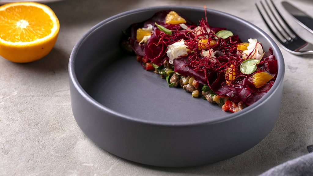 (steamed thick edge of bull with baked vegetables and farm sour cream)