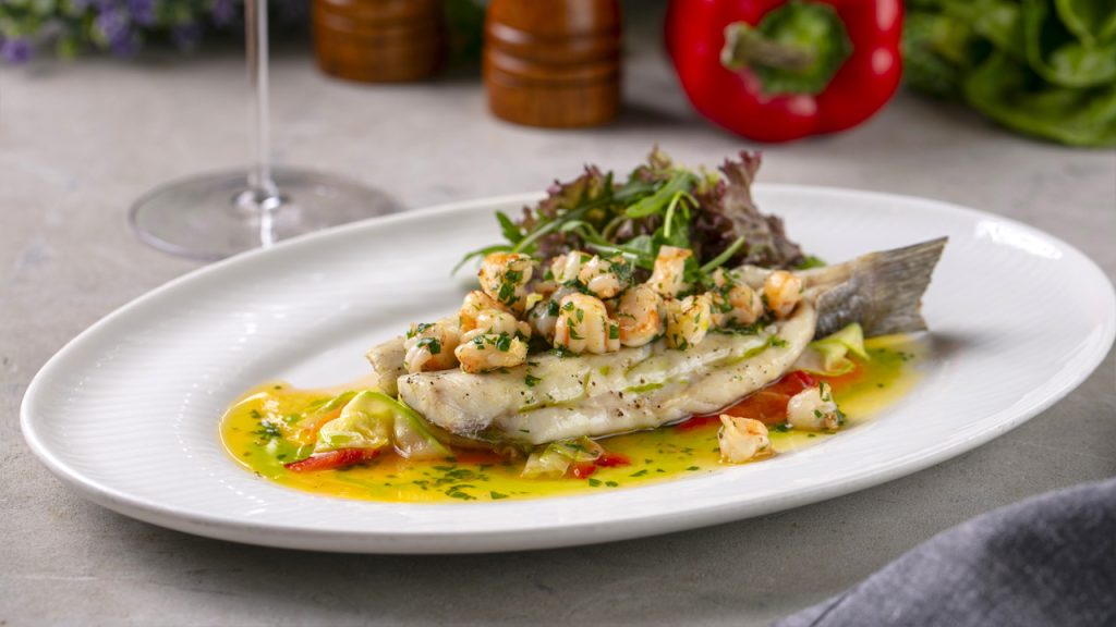 Запеченный сибас с креветками, молодым кабачком, листьями салата, руколой и красной икрой