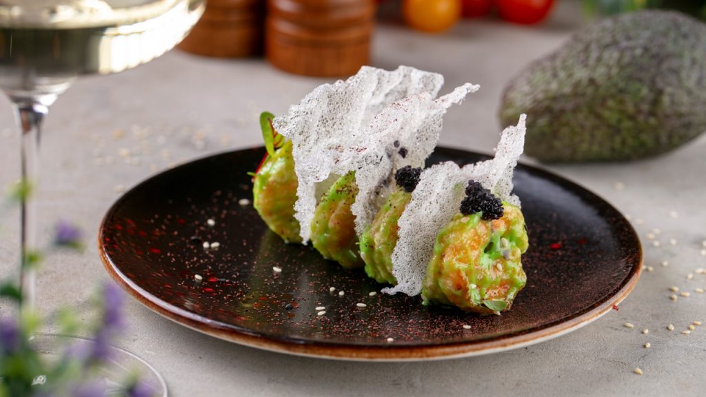 Креветки васаби с икрой палтуса и рисовыми чипсами