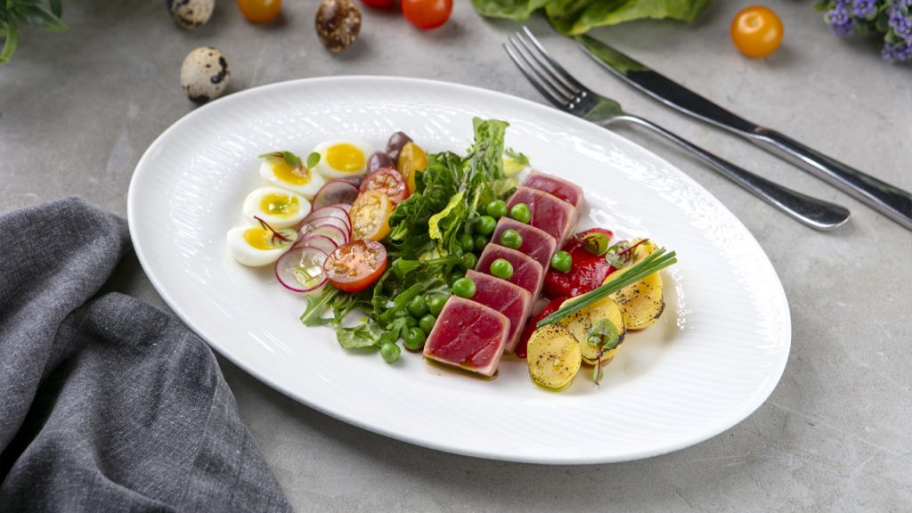 Обжаренный тунец с мини-картофелем, редисом, запеченным сладким перцем и перепелиными яйцами