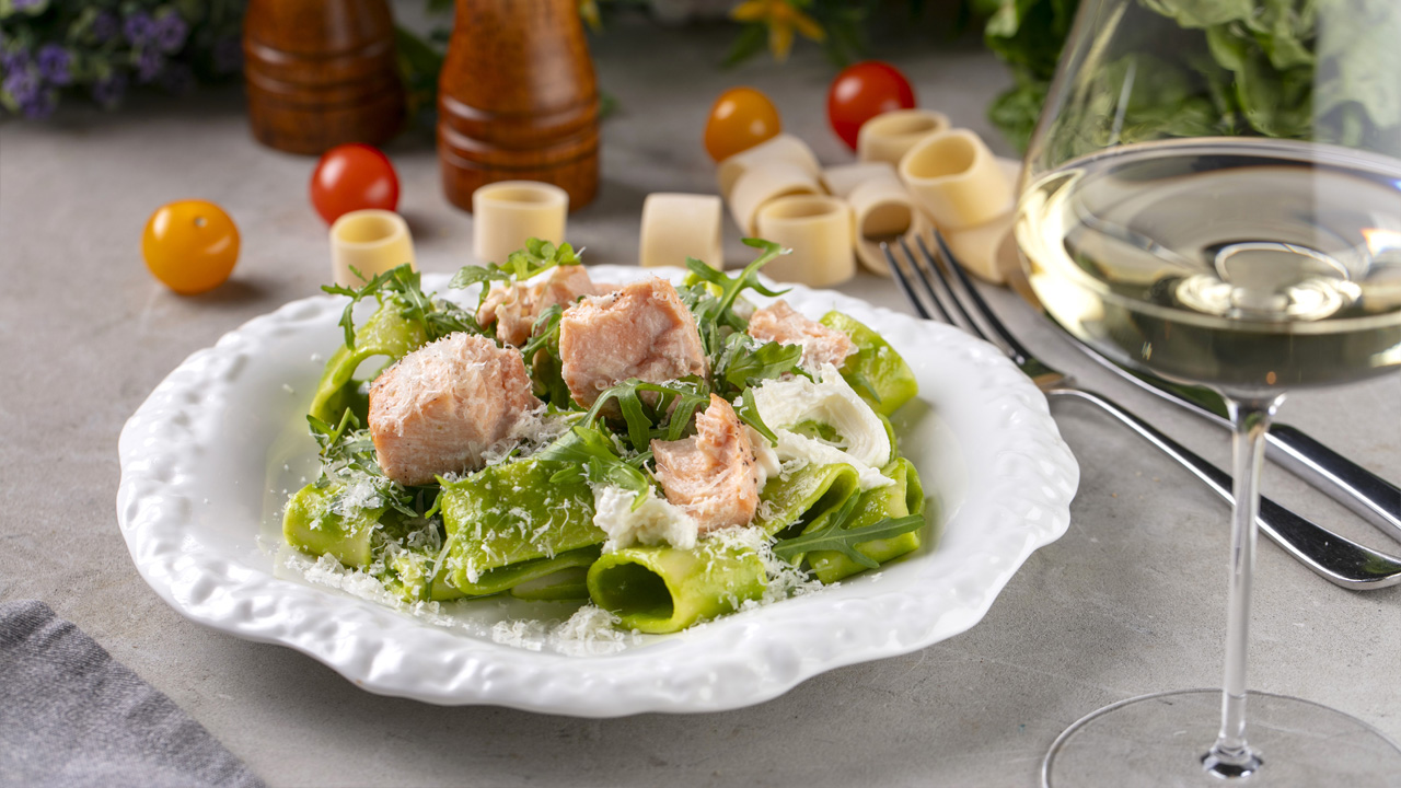 Паста каламарата с запеченным лососем, страчателлой, руколой, соусом из свежего шпината и пармезаном