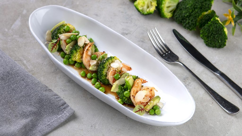 Сочные креветки с брокколи, авокадо, зеленым горошком, кунжутом и миндальными лепестками