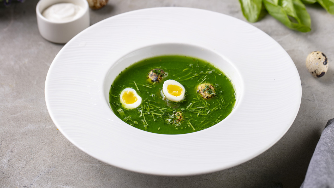 Щавелевый суп с гусем, картофелем, перепелиным яйцом, весенней зеленью и сметаной